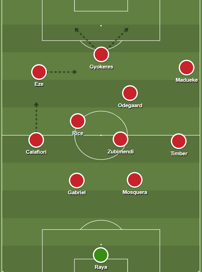 💡 Același dublu-pivot Rice - Zubimendi, cu un Dec mai puțin avântat în zona din stânga tocmai pentru a-i da libertate mai mare de a intra în centru lui Eze? De urmărit… 👀
