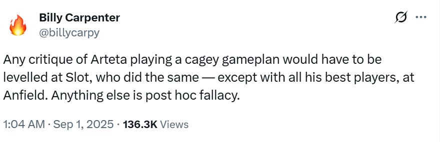 Orice critică la adresa lui Arteta pentru planul de joc ar trebui să se îndrepte și spre Slot, care a jucat la fel, chiar cu mai puține absențe notabile.