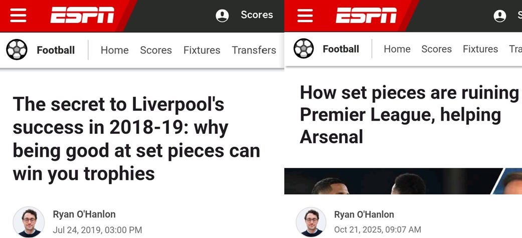 Și în timp ce alte echipe pierd puncte în fața unor adversari care se apără adânc, Arsenal a găsit soluții. Da, uneori prin faze fixe… iar asta, în mod bizar, a ajuns motiv de critică.