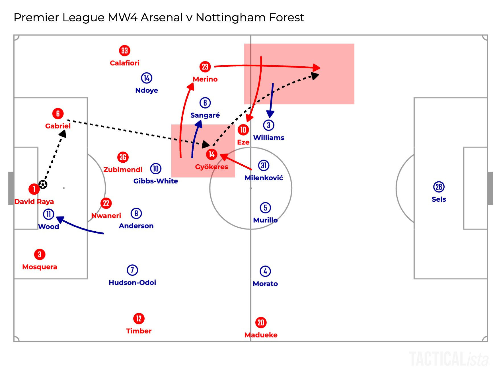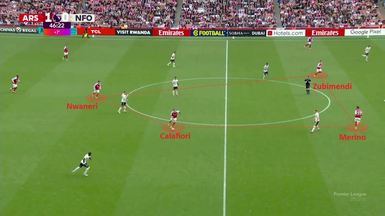 L-am văzut pe Calafiori mijlocaș central-dreapta 😱, pe Nwaneri primind în fața apărării sau pe Zubimendi și Merino în preajma lui Gyokeres. Toate schimbările astea i-au zăpăcit pe cei de la Forest, iar pe noi ne-au ajutat polivalență și calitățile „all-over-the-field” ale jucătorilor noștri.