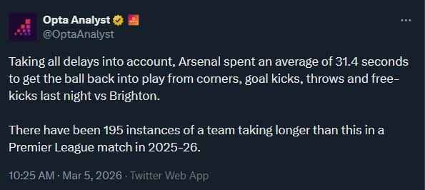 Conform datelor Opta, Arsenal a întârziat în medie 31.4 secunde reluarea jocului în meciul cu Brighton.