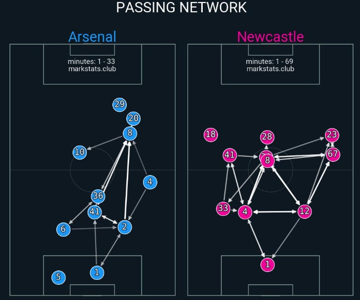☝️ O rețea a paselor care arată ciudat pe hârtie, dar în practică mi-au plăcut mai multe secvențe în prima parte, cu Eze uitând de flancul stâng, venind des în centru și făcând superioritate în acea zonă.