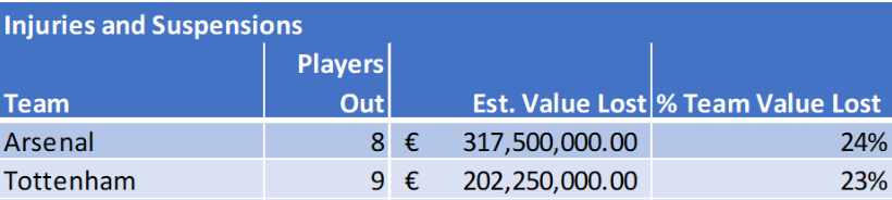 Cei de la Cannon Stats aveau un grafic care arăta că atât Arsenal, cât și Spurs au absențe care cumulează aproape un sfert din valoarea întregului lot.